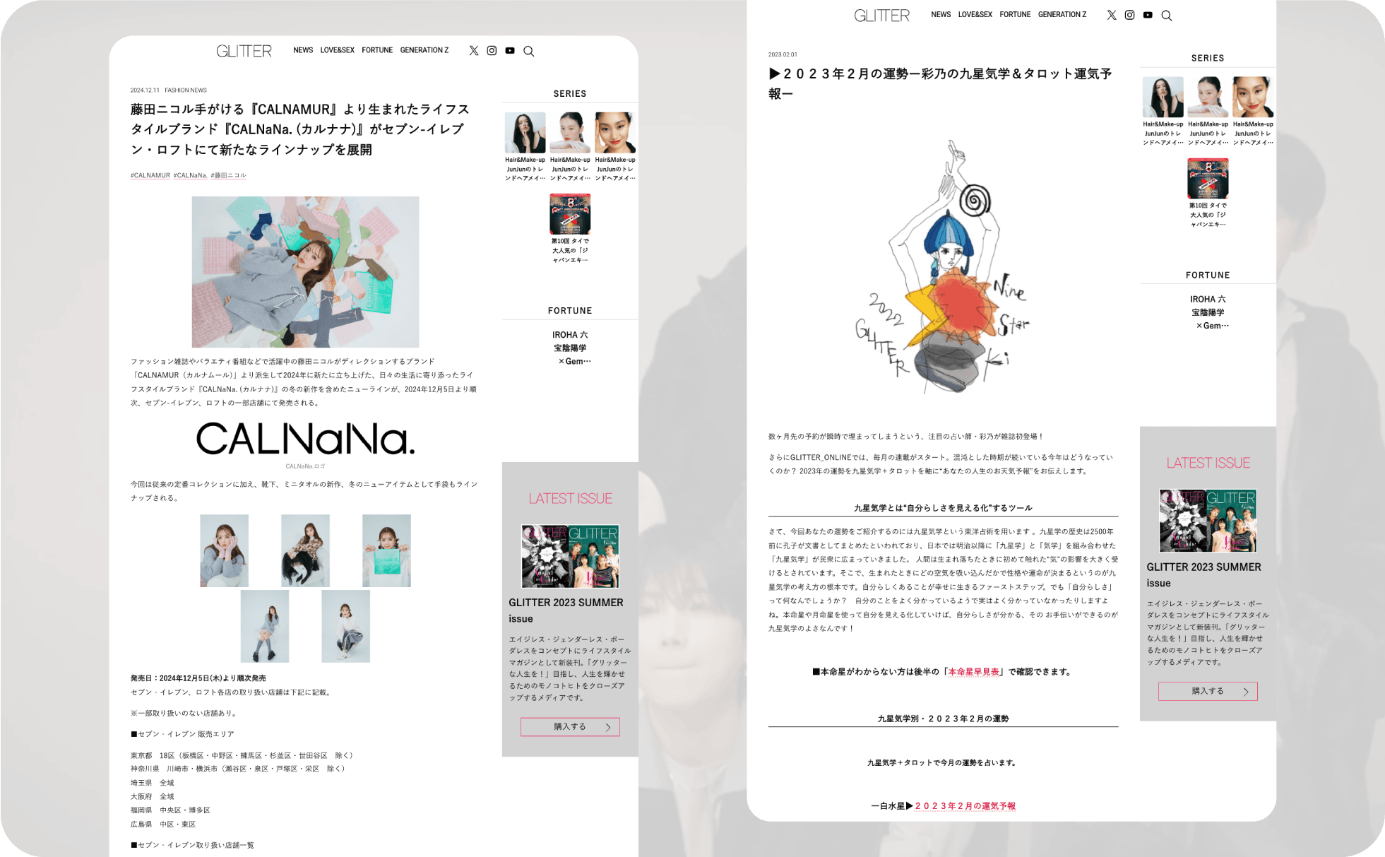 女性向けメディア誌「Glitter」の公式WEBサイトの作成・運営に従事しました。