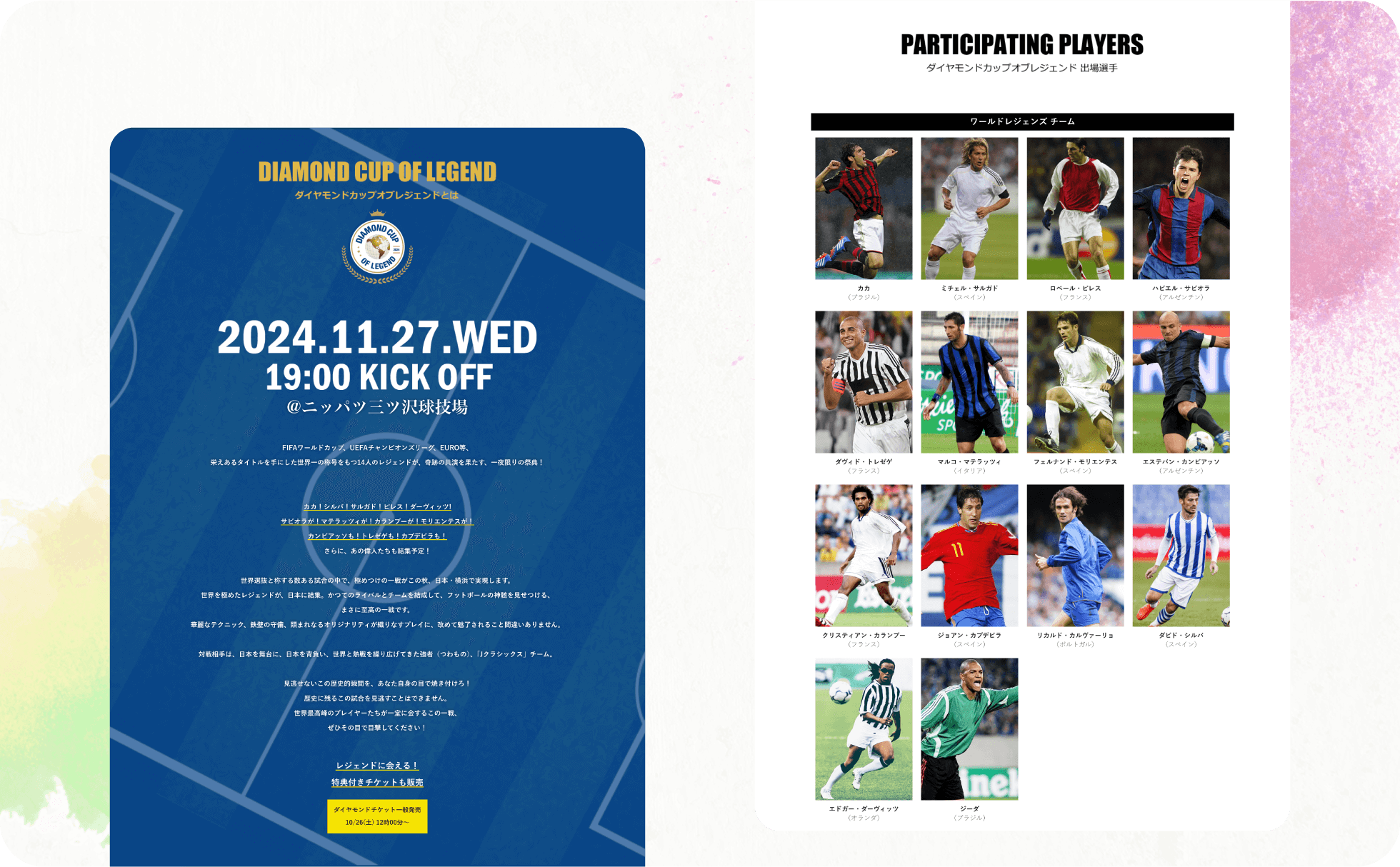 カカ!シルバ!サルガド!ピレス!ダーヴィッツら世界のレジェンドとJクラシックスが激突する夢の舞台「ダイヤモンドカップオブレジェンド」!試合会場では限定グッズや特別イベントも充実!